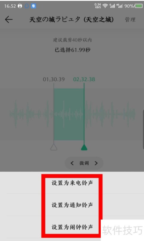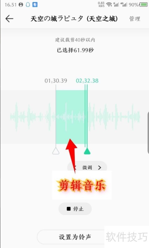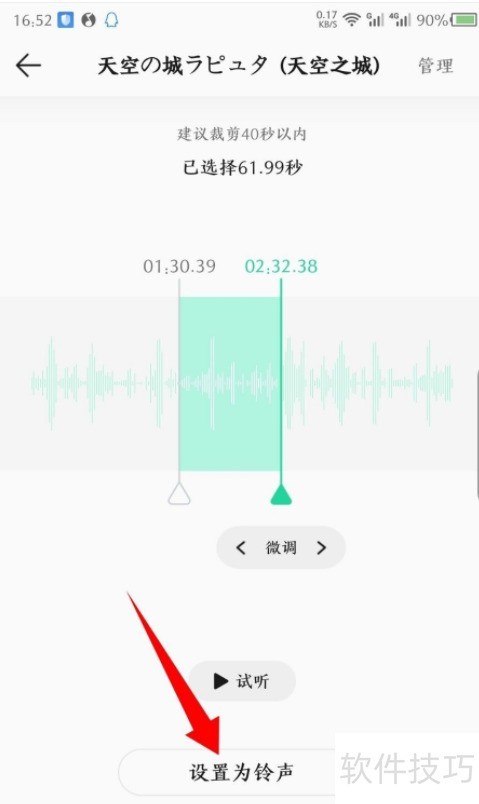 4、 裁剪音乐后,点击底部按钮设为铃声,操作所示。