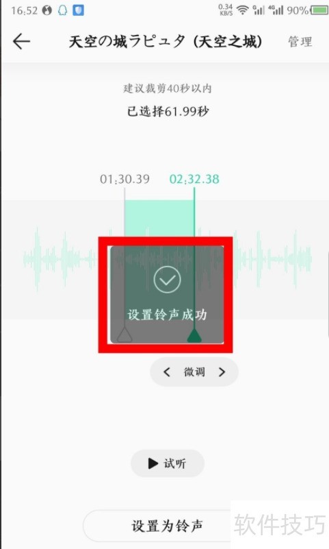 6、 点击后即可成功设置为铃声,屏幕上会显示设置成功的提示,所示。