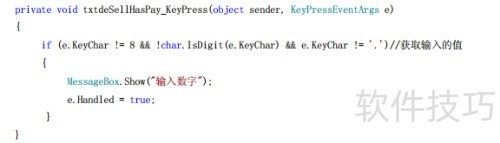 6、 当控件获得焦点并按下键盘时触发该事件。以商品销售界面中的txtdeSellPrice文本框为例,此控件用于输入销售单价,其KeyPress事件可在用户输入时实时响应按键操作,便于对输入内容进行验证或处理,确保数据的准确性与规范性。