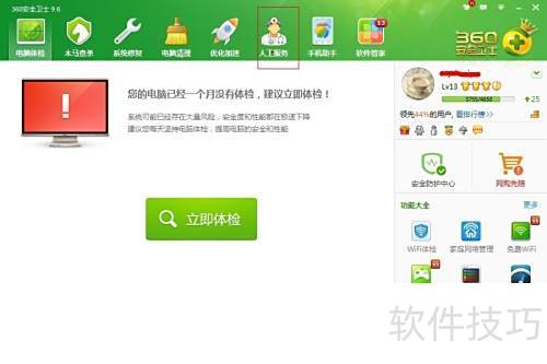 1、 使用电脑时,常会遇到各种突发问题,既无需跑维修店,自己又难以处理。此时可借助360安全卫士的人工服务来解决。现在,让我们启动360安全卫士,进入相关服务界面,快速应对系统故障与安全困扰,让电脑运行更顺畅稳定。