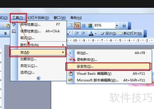 1、 将宏安全性调至最低,确保后续按钮功能正常使用,确认设置后重新启动PowerPoint2003即可。