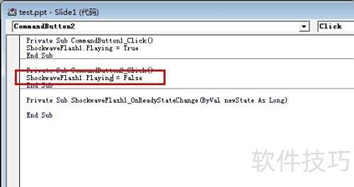 8、 双击第二个暂停按钮,在红框内两行代码之间添加 shockwaveFlash1.playing=false,无需输入引号,完成后关闭代码窗口即可。