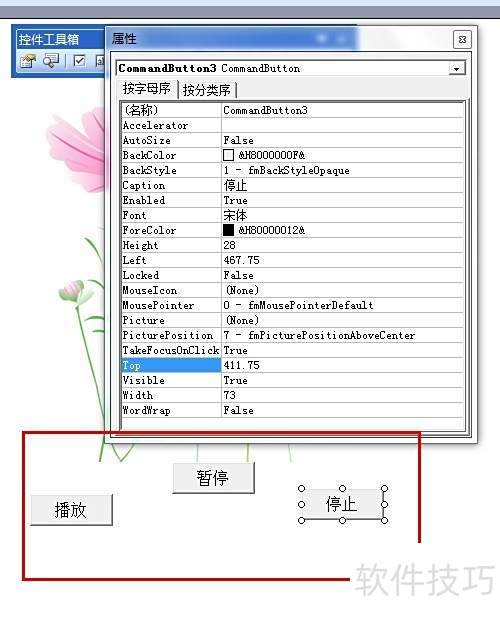 5、 点击控件工具箱中的第一个属性按钮,在弹出的属性对话框中,将Caption栏的commandbutton1更改为播放,并调整按钮大小。按照相同方法,依次设置另外两个按钮,分别将其Caption修改为暂停和停止,并适当调整尺寸以确保界面整齐美观。