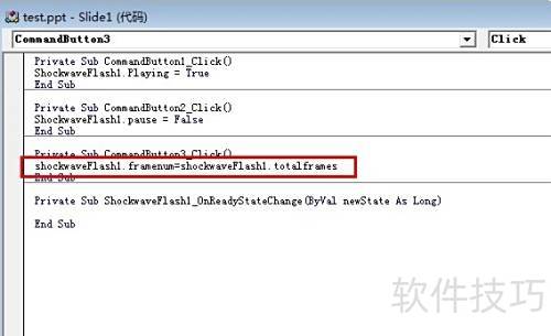 9、 第三个按钮执行相同操作,输入shockwaveFlash1.framenum=shockwaveFlash1.totalframes即可完成设置。
