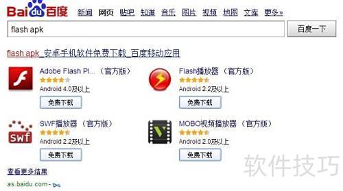 2、 百度搜索结果中,部分APK即便成功安装也无法正常使用,仅有少数能在手机上运行并支持Flash文件播放。