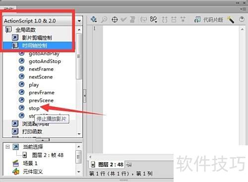 5、 在动作面板中输入stop()停止播放。