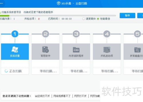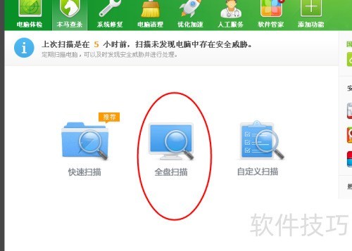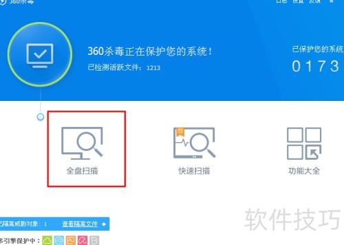 1、 启动360杀毒程序,选择全盘扫描功能,全面检测并清除电脑中的病毒。