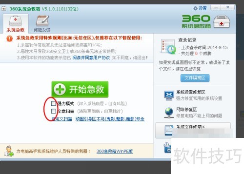 5、 勾选急救选项中的两项,点击开始急救,即可彻底清除木马病毒。