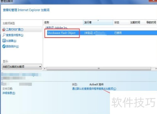 3、 在管理加载项界面中,找到并选择Shockwave Flash Object,确认其状态,若被禁用则点击启用,确保该插件正常运行,以支持网页中相关多媒体内容的显示与操作。
