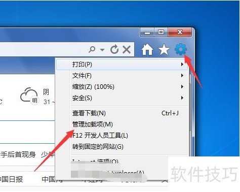 1、 启动IE浏览器,点击右上角齿轮图标,从下拉菜单中选择管理加载项即可。