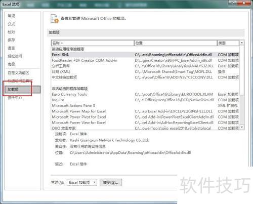 5、 在加载项右侧窗格中,点击管理可查看Excel所有加载项。找到名为OIIO效率专家的选项,选中后即可进行相关配置和管理操作,以便根据需要启用或调整其功能设置。