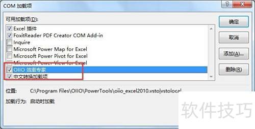 7、 在Com加载项窗口中,选中OIIO效率专家前的复选框,点击确定按钮,即可完成该插件的加载操作。