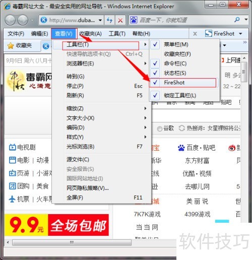 4、 启动浏览器,首次使用或需加载插件。所示,点击查看菜单,选择工具栏,并在FireShot选项前打勾即可启用。