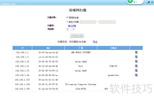 4、 可查看局域网内扫描到的设备,显示IP、MAC地址、厂商及设备名称等信息,支持点击导出将列表保存。