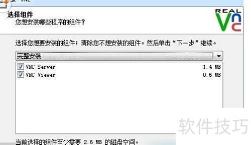 1、 需先在电脑安装VNC服务端,运行下载的程序,按提示进入安装界面,路径使用默认设置,在组件选择时勾选完整安装即可。
