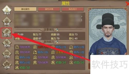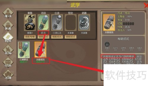 3、 所示,在武学界面选择,建议修炼并装备太极剑法,可显著提升武力值。