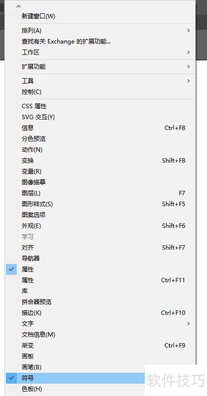 2、 在菜单栏下方点击窗口选择符号,或使用快捷键Ctrl+Shift+F11。
