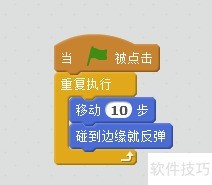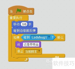 3、 点击矩形区域设定脚本,点击绿旗后重复执行移动10步,碰到边缘即反弹。再添加碰到侦测积木,结合如果……那么结构,当碰到甲壳虫时,显示甲壳虫并终止程序。