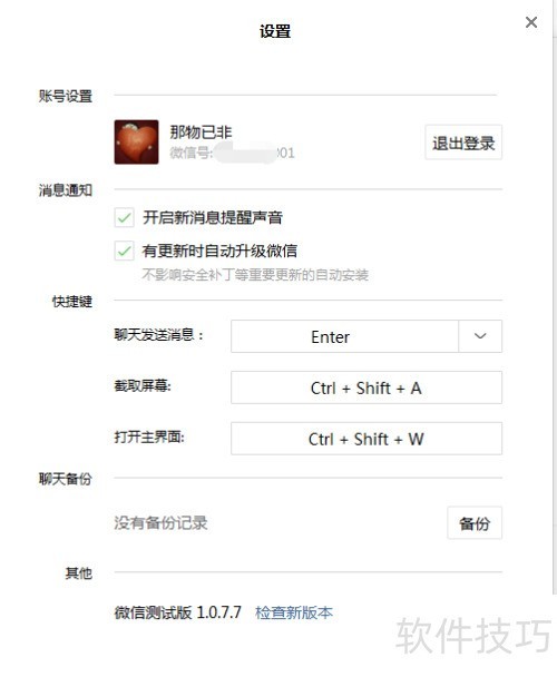 9、 页面包含账号注销、快捷键设置、聊天记录备份等功能,操作简便。