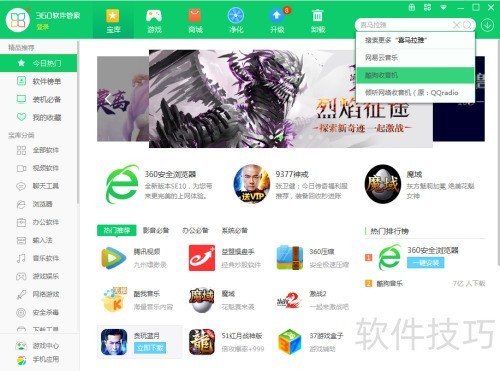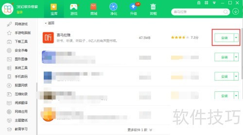 5、 打开360软件管家,搜索喜马拉雅即可找到并下载该应用。