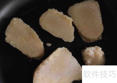4、 锅烧热后倒油,油热放入裹满蛋液的粽子片煎至金黄。