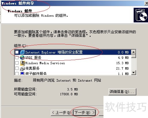 5、 打开Windows组件向导窗口,找到Internet Explorer增强的安全配置选项,将其前面的勾选取消即可完成设置。