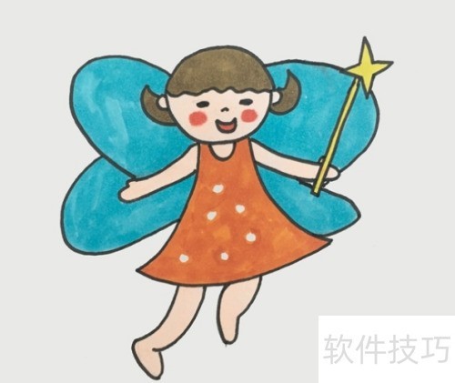 4、 为小精灵上色,翅膀涂成蓝色,裙子用红色,保留白色波点装饰,魔法棒涂黄色,头发为褐色,眼睛下方添上腮红。色彩完成后,一个可爱的小精灵形象便生动呈现,简单又充满童趣。