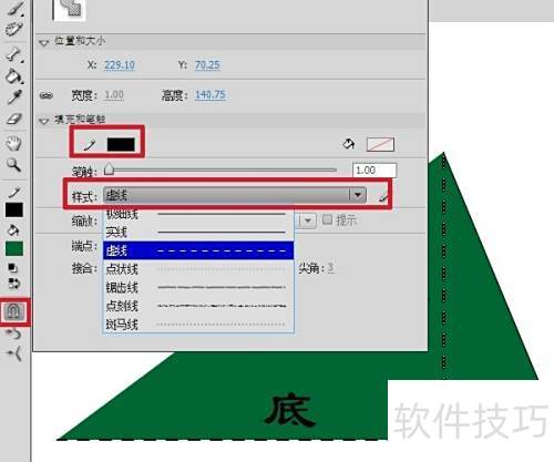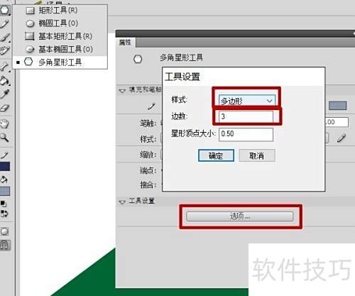 1、 在工具栏选取多角星形工具,点击属性面板中的选项,样式选择多边形,设定边数为3,确认完成设置。