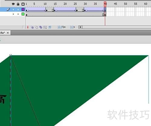 10、 在第30帧和第40帧分别插入关键帧,将第40帧的元件向上移动并与原图边缘对齐,所示。在第30帧创建补间动画,实现第三次移动,整个动画过程至此完成。