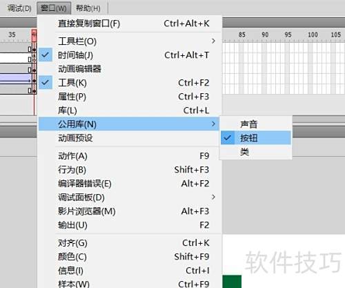 11、 动画在影片中会自动循环播放,无法人为控制,这在边讲解边演示的教学过程中十分不便。为此,我们可添加一个控制按钮,实现对动画三步移动的操控。Flash软件自带丰富的按钮元件,调用非常便捷,只需进入窗口菜单,选择公用库中的按钮即可使用。
