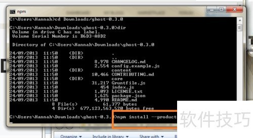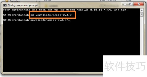 7、 在 Node.js 命令提示符中,使用 cd 命令进入解压后的 Ghost 文件夹所在路径,例如:cd Downloads/ghost,确保当前目录正确切换至该文件夹内,以便后续操作顺利进行。