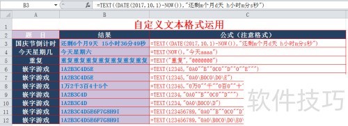 1、 通过TEXT函数实现文本格式转换,灵活应用于倒计时显示(含年月日时分秒)、中文星期输出、重复文字游戏及嵌字趣味练习,具体示例所示。