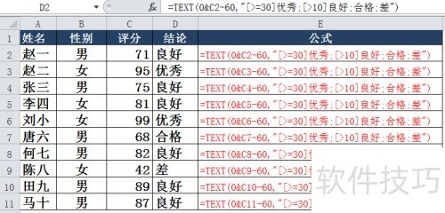 3、 当评分大于或等于90时,评定为优秀;评分在70至89之间为良好;60至69之间为合格;低于60则为差。为实现自动判定,可使用公式=TEXT(0&C2-60,优秀;良好;合格;差),输入后按回车,并向下拖动填充至其他单元格,系统即可根据对应分数自动输出评定结果。该公式中,TEXT函数结合了数字与文本格式规则,其中格式代码由四个分号分隔的文本组成,分别对应不同区间。当计算结果为正或零时,显示前三个文本之一,为负时则显示最后一个差。在数值前添加0&并连接原值减60的结果,可避免负数前出现减号,确保格式统一,显示正确。实际效果如示例图所示,所有等级均准确呈现。