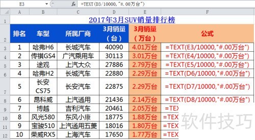 4、 将3月SUV销量数据由台转换为万台,可使用公式=TEXT(D3/10000,.00万台),实现简便快捷的单位转换,效果所示。