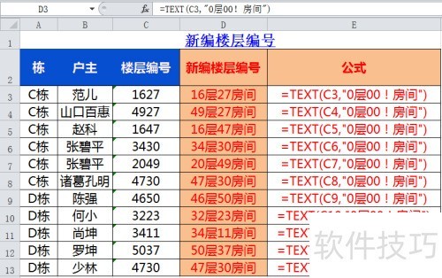 5、 有业主反映楼层编号不够清晰,难以理解,希望物业将编号调整为x层xx房间的格式。在D3单元格中输入公式=TEXT(C3,0层00!房间),再向下复制填充即可快速完成,操作简便,效果直观,所示。