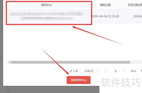 7、 弹出窗口将显示授权Key,点击领取按钮即可获取。