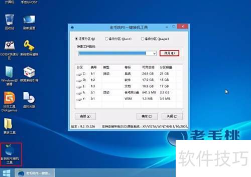 2、 进入Win8PE系统桌面后,老毛桃PE装机工具将自动运行(若未启动,请双击桌面图标),随后点击工具界面中的浏览按钮,操作所示。