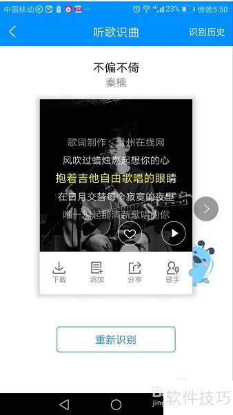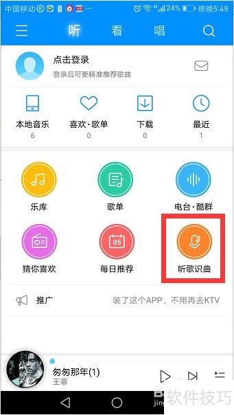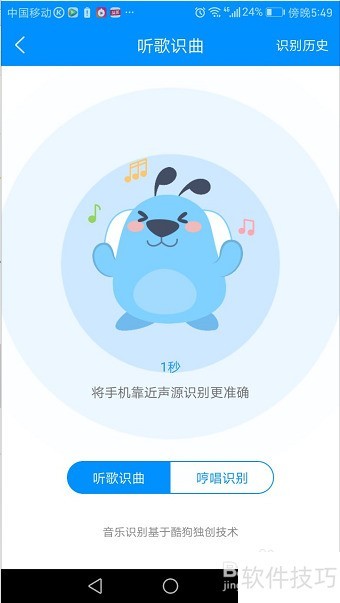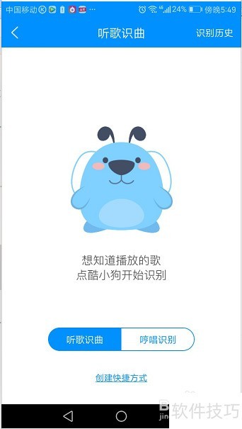 1、 打开酷狗音乐,使用听歌识曲功能。