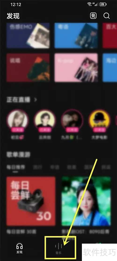 1、 打开汽水音乐首页,点击底部的音乐按钮即可。