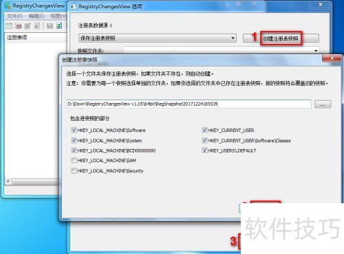 2、 运行RegistryChangesView,点击右上角创建注册表快照,依次选择创建快照并确认即可完成操作。