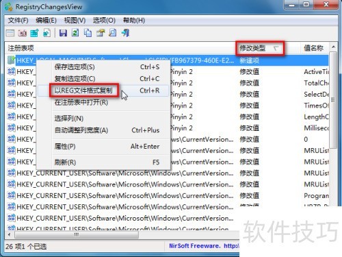 4、 双击修改类型两次,使新建项位于首位,选中该新建项,右键选择以REG文件格式复制。