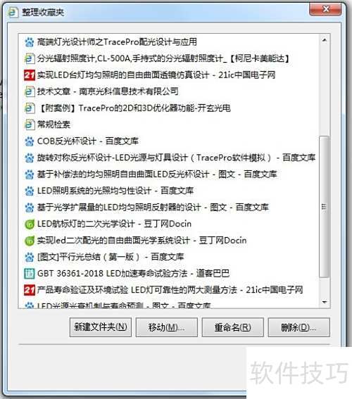 5、 点击管理收藏夹将打开相应窗口,可在其中删除、移动或重命名收藏内容,还能新建文件夹,方便添加新的收藏网址。