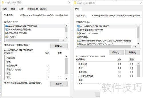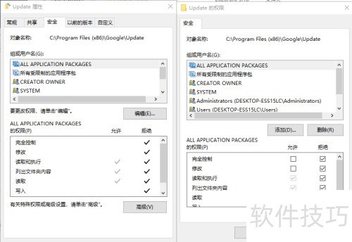 8、 在update文件夹上右键选择属性,切换至安全选项卡并编辑权限。首先找到所有受限制的应用程序包,勾选拒绝所有权限;接着找到users组,同样设置为拒绝全部权限。最后点击确定,保存并应用更改,完成文件夹权限的设置操作。