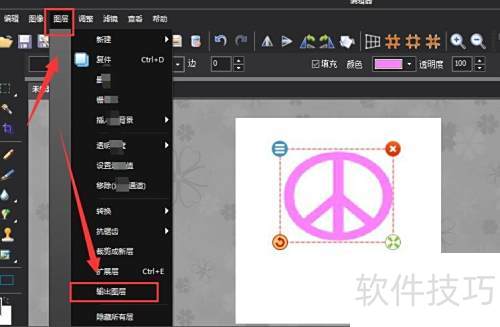 3、 所示,在完成图标绘制后,选中图形并打开图层菜单,选择其中的输出图层功能即可进行后续操作。