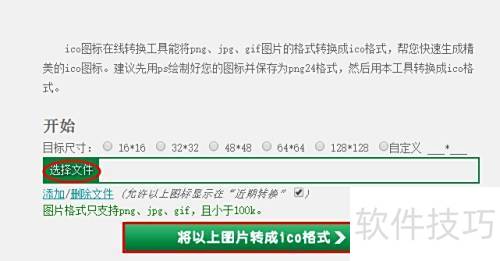2、 进入主页后,选择所需图标尺寸,点击选择文件上传图片,随后点击将以上图片转换成icon格式,即可将喜爱的图片转为icon图标。