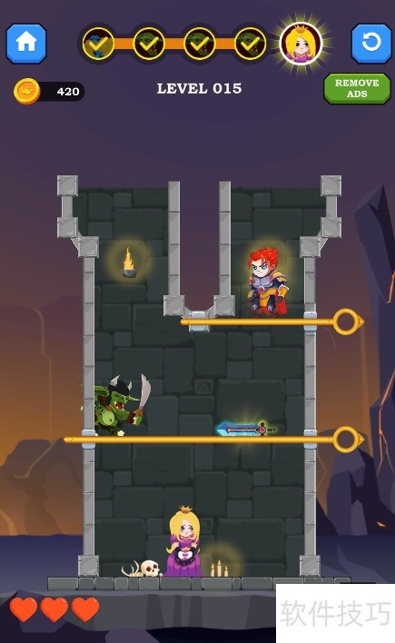 1、 本关含两根横拉针,少年下方有宝剑,具体布局见图示。