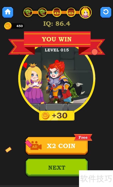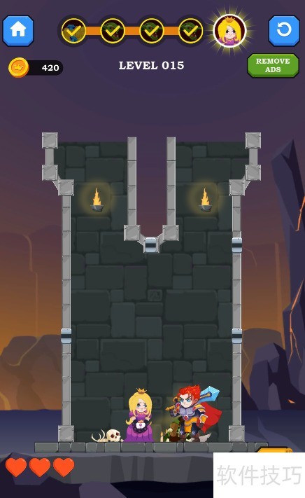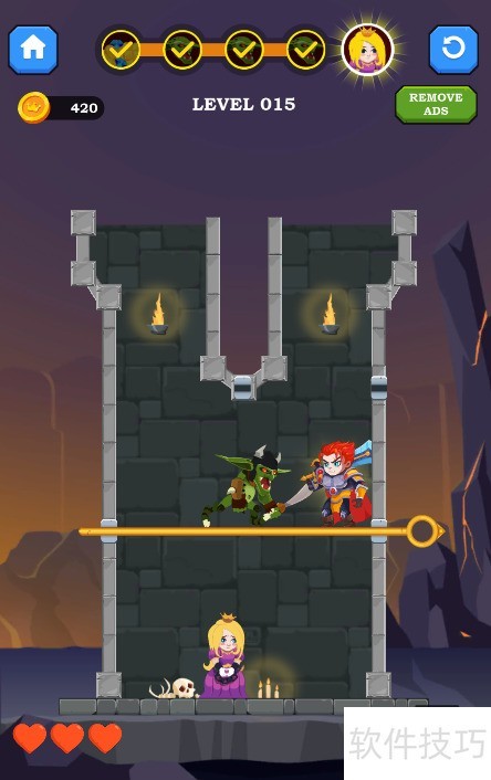 4、 少年跃至底部救出公主,随即触发通关动画,顺利过关。