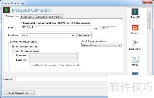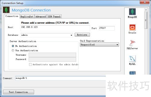 5、 选择MongoDB,填写连接信息后点击确定即可完成设置。