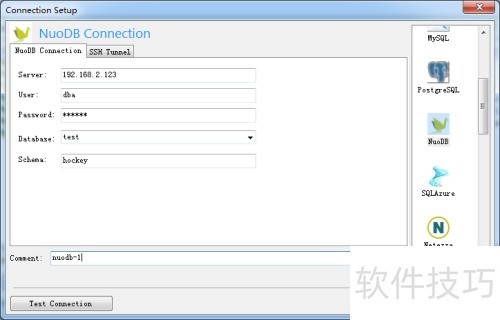 5、 选择nuodb,填写连接信息后点击确定即可完成操作。