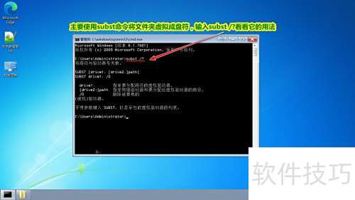 2、 利用subst命令可将文件夹虚拟为磁盘驱动器,输入subst /?可查看具体用法。